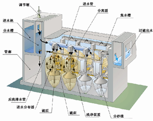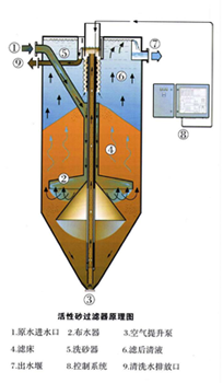 流砂过滤器采用逆流原理,污水由设备上部进入分配管并由安装在设备底部的分水器分水,向上流经滤床而被过滤,然后由流砂过滤器上部的滤液出水口流出。被滤砂截留的杂质和滤砂一起从设备锥形底部经滤料提升装置提升至设备顶部的洗砂器内。砂的清洗从被滤料提升装置提升时就开始,在紊流作用下使杂质从砂粒中分离出来。杂质随洗砂水经污水排放口排放,清洗后的砂颗粒(密度高)自由沉降到砂床上。实现水的净化与砂的清洗同时进行的连续过滤过程。